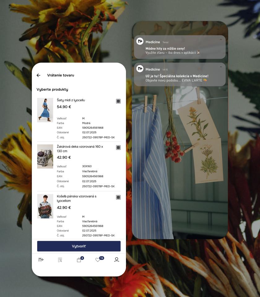 Vrátenie tovaru v aplikácii je jednoduché a rýchle – stačia štyri kroky bez zbytočných formalít. Spôsob vrátenia tovaru si vyberiete podľa svojich potrieb a vďaka histórii vrátených produktov si skontrolujete ich stav, kedykoľvek budete chcieť.