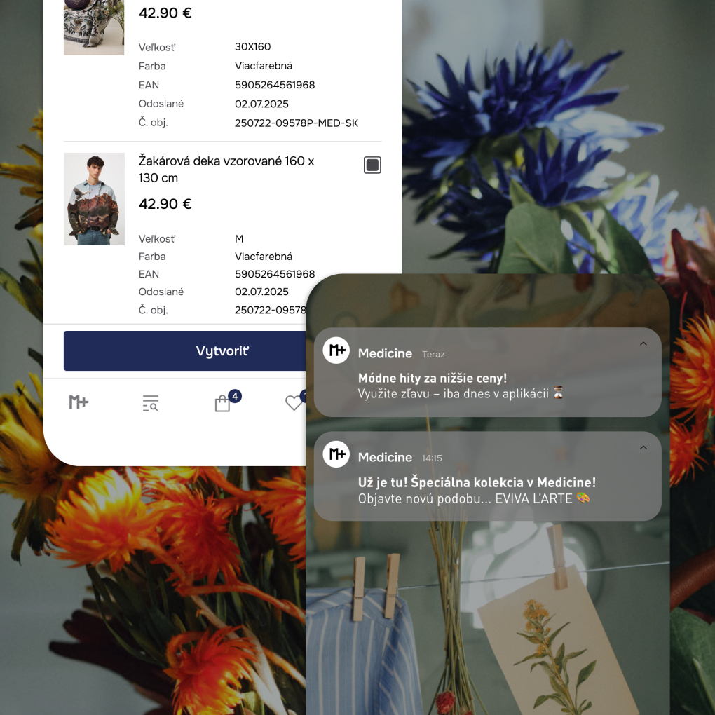 Nepremeškajte žiadnu akciu – vďaka push upozorneniam v aplikácii Medicine budete vždy informovaní o novinkách, limitovaných kolekciách, akciách a zľavách dostupných iba v aplikácii. Teraz môžete mať svet módnych možností doslova na dosah ruky!